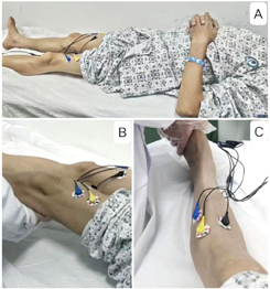注:A为肌电信号采集体位,B为股直肌在抗阻下做最大等长收缩,C为胫骨前肌在抗阻下做最大等长收缩