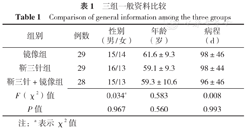 试验过程中靳三针+镜像组脱落2例,1例因个人原因无法接受后续治疗,1例因中医科介入腹部埋线疗法后退出治疗,疗程不足。镜像组及靳三针组各脱落1例,因患者配合度及情绪较低,选择自行退出本课题。最终镜像组、靳三针组、靳三针+镜像组分别纳入29例、29例、28例。三组患者性别、年龄、病程比较,差异无统计学意义(P>0.05),见表1。