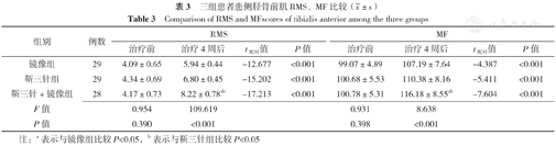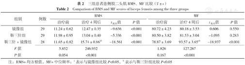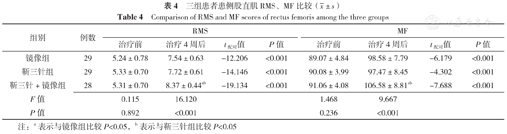 组内比较:三组患者患侧胫骨前肌、股直肌、腓肠肌治疗4周后RMS、MF高于治疗前,差异有统计学意义(P<0.05);靳三针组、镜像组患侧股二头肌治疗4周后RMS高于治疗前,差异有统计学意义(P<0.05);靳三针组、镜像组患侧股二头肌治疗前后MF比较,差异无统计学意义(P>0.05);靳三针+镜像组患侧股二头肌治疗4周后RMS、MF高于治疗前,差异有统计学意义(P<0.05),见表2,表3,表4,表5。