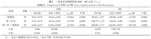 注:RMS=均方根值,MF=中位频率;a表示与镜像组比较P<0.05,b表示与靳三针组比较P<0.05