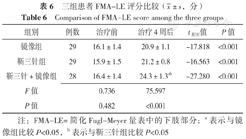 三组患者治疗前FMA-LE评分比较,差异无统计学意义(P>0.05);三组患者治疗4周后FMA-LE评分比较,差异有统计学意义(P<0.05);其中治疗4周后FMA-LE评分靳三针组与镜像组比较,差异无统计学意义(P>0.05);靳三针+镜像组患者治疗4周后FMA-LE评分高于靳三针组、镜像组,差异有统计学意义(P<0.05)。三组患者治疗4周后FMA-LE评分均高于同组治疗前,差异有统计学意义(P<0.05),见表6。