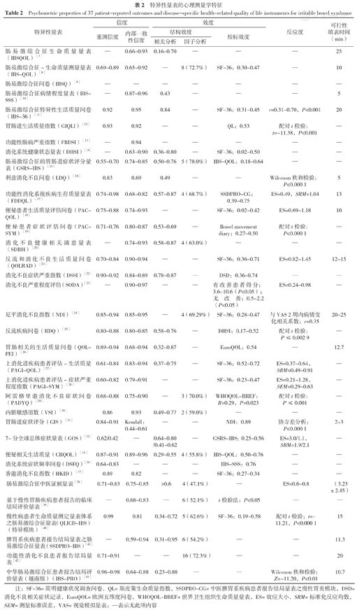 | 肠易激综合征特异性生活质量问卷(IBS-36)[11] | 0.92 | 0.95 | 0.84 | — | SF-36:0.31~0.45 | r=0.31~0.70,P<0.001 | 20 |