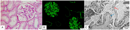 注:A为小灶性肾小管基底膜增厚、间质少量纤维增生(PAS染色),B为免疫荧光Ⅳ型胶原α3表达正常,C为电镜示基底膜变薄(红色箭头所示)、小节段分层(蓝色箭头所示)