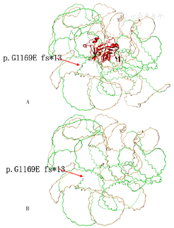 采集先证者及其他家系成员(先证者父母,先证者丈夫及其子女,先证者姐姐及其丈夫和子女)外周血标本2 ml送至北京迈基诺医学检验所,进行二代测序分析先证者致病基因,用Sanger测序方法在家系其他成员对所发现的致病基因变异及父母来源进行验证。结果显示,先证者COL4A4基因有1个杂合移码突变:COL4A4基因编码区第3 506~3 528位碱基缺失,导致第1 169位氨基酸甘氨酸变为谷氨酸,即p.G1169Efs*13,并终止于第1 181位(图3)。与野生型COL4A4蛋白相比,突变的COL4A4改变了蛋白结构。蛋白结构域信息参考EMBL-EBI数据库[8],蛋白三维结构图见图4。对照正常人群数据库(dbSNP、千人基因组、ESP6500、EXAC),该位点变异分布频率为-,为低频变异。检索HGMD数据库未有该位点的相关报道,ClinVar数据库无该位点致病性分析结果。根据美国医学遗传学与基因组学会(ACMG)《ACMG遗传变异分类标准与指南》[9],该变异被解释为"疑似致病性变异"〔PVS1+PM2:PVS1,该变异为零效变异(移码变异,可能导致基因功能丧失);PM2,在正常人群数据库中的频率为-,为低频变异〕。进一步Sanger测序证实,先证者父亲,先证者两个女儿、儿子,先证者姐姐及其儿子,chr2-227898174-227898210显示c.3506-3528del杂合突变,其他家系成员chr2-227898174-227898210未显示突变。经家系验证分析,该变异来自先证者父亲。先证者临床诊断达到AS诊断标准[5],遗传模式符合常染色体显性遗传,基因诊断为COL4A4杂合突变,符合ADAS诊断标准[10],故诊断为ADAS。