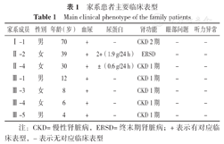 | 家系成员 | 性别 | 年龄(岁) | 血尿 | 尿蛋白 | 肾功能 | 眼部问题 | 听力异常 |