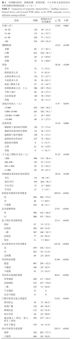 不同倾向特征、使能资源、需要因素、个人中医文化居民社区中医药服务利用的比较〔n(%)〕