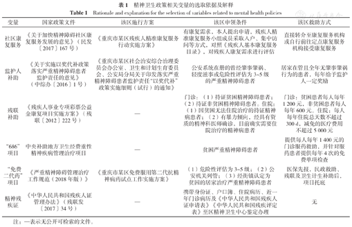 | "免费二代药"项目 | 《严重精神障碍管理治疗工作规范(2018年版)》 | 《重庆市某区免费服用第二代抗精神病药试点工作实施方案》 | (1)危险性评估为3~5级;(2)公安机关列管;(3)经街镇认定为贫困的居家治疗严重精神障碍患者 | 医保先报,民政救助、残联及卫生计生补助后,项目托底 |