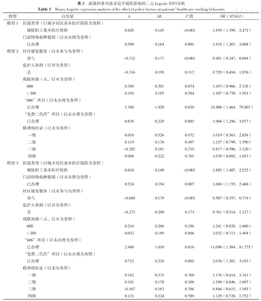 以患者是否就医为因变量(赋值:否=0,是=1),以人口学特征为控制变量,模型1以基本医疗保险政策覆盖情况为自变量,模型2以精神卫生政策覆盖情况为自变量,模型3以基本医疗保险政策和精神卫生政策覆盖情况为自变量。模型1结果显示:城镇职工基本医疗保险参保患者发生就医行为的可能性高于城乡居民基本医疗保险参保患者〔OR(95%CI)=1.895(1.399,2.472)〕,已办理门诊特殊病种报销患者发生就医行为的可能性高于未办理的患者〔OR(95%CI)=1.818(1.267,2.608)〕。模型2结果显示:参与社区康复服务的患者发生就医行为的可能性低于未参与患者〔OR(95%CI)=0.491(0.347,0.694)〕,办理了"686"项目患者发生就医行为的可能性高于未办理的患者〔OR(95%CI)=10.808(1.464,79.807)〕,办理了"免费二代药"项目患者发生就医行为的可能性高于未办理患者〔OR(95%CI)=1.966(1.256,3.077)〕。模型3结果显示:城镇职工基本医疗保险参保患者发生就医行为的可能性高于城乡居民基本医疗保险参保患者〔OR(95%CI)=1.885(1.407,2.525)〕,已办理门诊特殊病种报销患者发生就医行为的可能性高于未办理的患者〔OR(95%CI)=1.688(1.155,2.468)〕,参与社区康复服务的患者发生就医行为的可能性低于未参与患者〔OR(95%CI)=0.507(0.357,0.719)〕,办理了"686"项目患者发生就医行为的可能性高于未办理的患者〔OR(95%CI)=11.090(1.504,81.775)〕,办理了"免费二代药"项目患者发生就医行为的可能性高于未办理患者〔OR(95%CI)=2.038(1.301,3.193)〕,见表3。