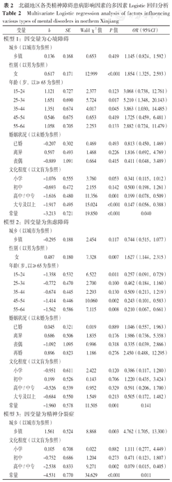 ±s)表示,计数资料以相对数表示,计数资料组间比较采用χ2检验。北疆地区各类精神障碍患病的影响因素分析采用多因素Logistic回归分析。以P<0.05为差异有统计学意义。