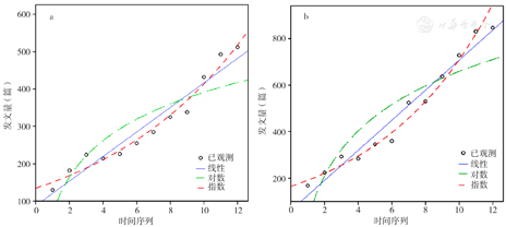 2010—2021年老年多重慢病领域每年的发文量整体呈上升趋势,如图2,中文文献年增长率为13.27%,外文文献年增长率为15.84%。对数据进行回归分析曲线估计,图3a中指数模型的r2最大(r2=0.959),图3b中指数模型的r2同样最大(r2=0.974),表明老年多重慢病领域国内外文献发文量均呈指数增长,该领域正处于发展阶段。