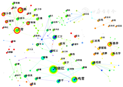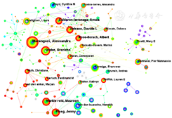 采用CiteSpace分析作者情况,根据平方根法:高产作者人数为发表1篇论文的作者人数的平方根[15],发表1篇中文文献的作者数为6 528人,发表1篇外文文献的作者数为16 291人,最终可以得出,中文核心作者为80人,外文核心作者为127人,中外作者合作网络知识图谱见图4,图5。