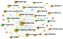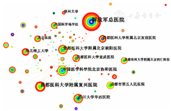 对机构信息进行保留最高级处理,对同一机构下不同部门的节点进行合并,绘制国内外机构共现图谱(图6,图7)。国内发文量最多的机构为解放军总医院,发表老年多重慢病领域文献69篇;国外发文量最多的机构为瑞典的卡罗林斯卡学院,发表文献80篇。