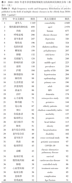 High frequency words and frequency distribution of articles published in the field of multiple chronic diseases in the elderly from 2010-2021 (partial)