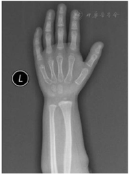 实验室及影像学检查:血常规、肝肾功能、电解质、心肌酶、血脂、血糖未见异常;甲状腺功能3项〔促甲状腺激素(TSH)、游离甲状腺素(FT4)、游离三碘甲状腺原氨酸(FT3)〕未见异常;促肾上腺皮质激素、皮质醇、17羟孕酮未见异常;染色体核型分析:46XX;微量元素6项(锌、铁、钙、镁、铜、铅)未见异常;25-羟基维生素D 89.63 μg/L。精氨酸联合左旋多巴激发试验生长激素(GH)峰值3.87 μg/L(>10 μg/L为正常),胰岛素样生长因子1(IGF-1)104 mg/L,胰岛素样生长因子结合蛋白3(IGFBP-3)3.62 mg/L。心脏彩超提示:房间隔卵圆孔未闭0.34 cm。肝胆胰脾双肾未见异常,肾上腺B超未见异常。左手腕骨X线片示:骨龄2岁,CSE伴指骨弥漫性缩短(图1)。脊柱正侧位片示:脊柱生理曲度可,无明显侧弯。颅脑+垂体磁共振成像(MRI)无异常。