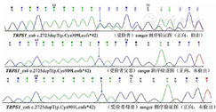 基因检测:根据患儿身材矮小、特殊面容,除GHD外,需考虑遗传代谢疾病的可能,取得患儿父母的知情同意后,抽取患儿及其父母外周血各2 mL,乙二胺四乙酸(EDTA)抗凝,送杭州迪安医学检验中心行全外显子测序及Sanger测序验证。结合患儿临床资料,对患儿的AARS,ANO5,CAPN3等共20 000个遗传性疾病基因组合外显子及其邻近±10 bp内含子进行了高通量检测和分析,并着重关注和分析了遗传代谢疾病、矮小症、生长发育迟缓、内分泌代谢系统相关的基因。结果显示,本次检测检出1个致病变异,TRPS1_ex6 c.2725dupT(p.Cys909Leufs*42),杂合移码突变;该移码突变会导致第909位氨基酸由半胱氨酸替换为亮氨酸并改变阅读框,在下游第41位密码子处产生终止密码子,使编码蛋白序列提前终止,产生截短蛋白或被降解,可能会对蛋白质的结构和功能产生较大影响;ClinVar数据库收录该变异位点为致病变异[6];该位点在正常东亚人群中的频率未见报道;经Sanger测序验证,患儿父母均未检出该变异,即患儿的该变异为新发变异;根据美国医学遗传学与基因组学会(ACMG)指南[7]判读为致病性变异,确诊为TRPS。患儿TRPS1_ex6 c.2725dupT(p.Cys909Leufs*42)发生杂合移码突变;其父母该位点均为正常基因。患儿及父母TRPS1基因突变序列见图2。