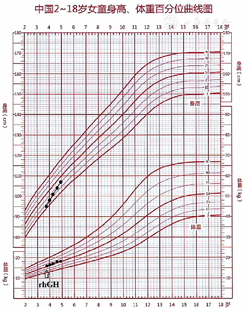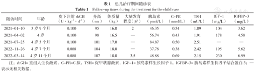 | 随访时间 | 年龄 | 皮下注射rhGH (U·kg-1·d-1) | 身高(cm) | 体质量(kg) | 大脑发育程度(岁) | 胰岛素(pmol/L) | C-PR (nmol/L) | TSH (mU/L) | IGF-1 (mg/L) | IGFBP-3 (mg/L) |