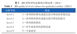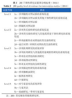 对于纳入的Meta分析证据质量分级采用GRADE证据质量分级系统,根据5个可能降低证据质量的因素(即偏倚风险、不一致性、间接性、不精确和发表偏倚)及3个可能提高证据质量的因素(即效应量大、剂量反应、可能的混杂因素),将每一个结局对应的证据进行质量分级,分为高(A)、中(B)、低(C)、极低(D)4个等级[29],各等级含义见表1。采用JBI证据预分级系统(2014)对所纳入的其他类型的证据进行分级,根据证据来源,将证据分为Level 1~5级[30],量性研究和质性研究的证据预分级标准分别见表2、表3。