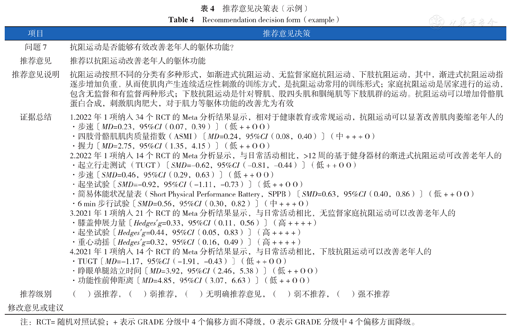 | 推荐意见 | 推荐以抗阻运动改善老年人的躯体功能 |