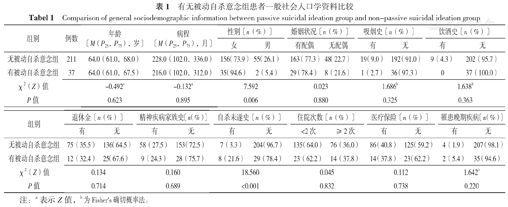 由经过一致化培训的医生进行MINI的评估。根据MINI自杀分量表中第一个条目"你是否觉得死了会更好或者希望自己已经死了"的回答评估受试者近1个月的被动自杀意念[10],将回答"是"的分为有被动自杀意念组(n=37),回答"否"的分为无被动自杀意念组(n=211)。