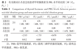 有被动自杀意念组的患者TSH水平低于无被动自杀意念组,而PRL水平高于无被动自杀意念组,差异有统计学意义(P<0.05)。两组患者FT3及FT4水平比较,差异均无统计学意义(P>0.05),见表2。
