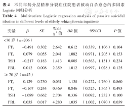 将患者按年龄进行分层(<70岁,≥70岁),因变量和自变量赋值情况同上,多因素Logistic回归分析结果显示,PRL水平(P=0.039)是≥70岁精神分裂症患者出现被动自杀意念的影响因素,见表4。