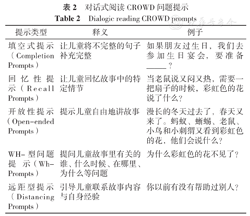 对话式阅读是在分享式阅读基础上发展出来的强调互动性的阅读方式,以图画书为背景,采用一系列的提示来鼓励儿童进行语言表达,并及时给予反馈,使儿童成为阅读的积极参与者和故事的讲述者[25,26]。对话式阅读中成年人所使用的策略依照不同的儿童年龄分为两组,分别针对2~3岁及4~5岁的儿童[28]。