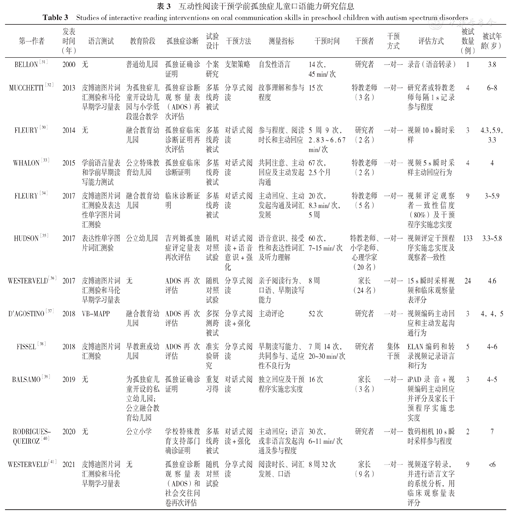 | FLEURY[34] | 2017 | 皮博迪图片词汇测验及表达性单字图片词汇测验 | 融合教育幼儿园 | 临床诊断证明 | 多基线跨被试 | 对话式阅读 | 主动回应、主动发起沟通及词汇发展 | 20次,8.3 min/次,5周 | 特教老师(5名) | 一对一 | 视频评定观察者一致性信度(80%)及干预程序实施忠实度 | 9 | 3~5.9 |