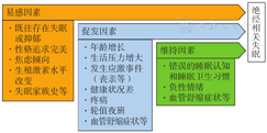 睡眠是一个复杂的生理过程。失眠的发生涉及个体行为、社会环境以及器官、细胞、分子等多个层面,是多个因素共同作用的结果。绝经相关失眠是在易感因素作用的基础上,受到促发因素作用时发生,在维持因素作用下持续存在[10],见图1。常见的易感因素为既往存在失眠或抑郁、性格追求完美、焦虑倾向、激素水平改变、失眠家族史等,促发因素有年龄增长、工作生活压力增大、发生应激事件(如丧亲等)、健康状况差、疼痛、轮值夜班、血管舒缩症状等,维持因素有错误的睡眠认知和睡眠卫生习惯、负面情绪、血管舒缩症状。