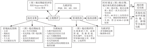 采集病史需要注意沟通的态度与技巧,充分考虑患者的受教育程度和理解能力,引导患者陈述事实,除常规病史询问外,还应着重了解(围)绝经期和睡眠相关症状。(围)绝经期病史采集:(1)近1年的月经情况,是否存在其他(围)绝经期症状;(2)是否行性激素治疗;(3)是否有其他慢性病史。失眠病史采集:(1)患者近1个月的作息时间、睡眠状况、失眠的表现形式、对日间功能的影响;(2)失眠开始的时间、与(围)绝经期症状及月经出血模式变化是否存在关系;(3)是否合并其他的睡眠障碍,如阻塞性睡眠呼吸暂停、不宁腿综合征等;(4)是否有焦虑症、抑郁症等共患疾病;(5)有无神经活性药物使用及物质依赖。