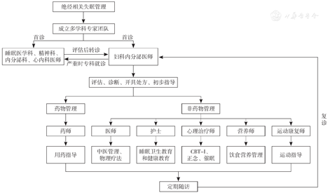 绝经相关失眠女性常没有意识到绝经与失眠的相关性,往返就诊于医院多个科室,增加了时间、人力、物力、财力的消耗。应当成立包括妇科、睡眠医学科、精神科、内分泌科、心内科医师及护士、药师、心理治疗师、运动康复师、营养师在内的多学科专家团队,对可疑绝经相关失眠的患者,首诊即进行绝经相关失眠的系统评估,排除心理、甲状腺功能障碍等问题引起的失眠后通过多学科团队内的转诊体系转至妇科内分泌门诊,由妇科医师行进一步的评估和诊疗,制定个体化的治疗方案,最大限度保证方案的可行性、治疗的有效性和患者的依从性。绝经相关失眠管理流程见图3。