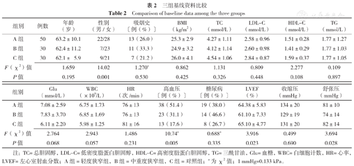 注:TC=总胆固醇,LDL-C=低密度脂蛋白胆固醇,HDL-C=高密度脂蛋白胆固醇,TG=三酰甘油,Glu=血糖,WBC=白细胞计数,HR=心率,LVEF=左心室射血分数;A组=轻度狭窄组,B组=中重度狭窄组,C组=对照组;a为χ2值;1 mmHg=0.133 kPa。