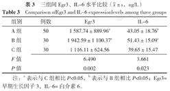 三组Egr3、IL-6水平比较,差异有统计学意义(P<0.05);B组与A组血清Egr3水平均高于C组,差异有统计学意义(P<0.05);A组与B组Egr3水平比较,差异无统计学意义(P>0.05);B组IL-6水平高于A组和C组,差异有统计学意义(P<0.05);A组和C组IL-6水平比较,差异无统计学意义(P>0.05),见表3。