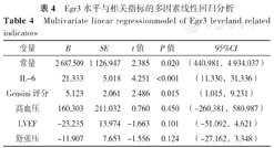 以血清Egr3水平(赋值:实测值)为因变量,以高血压(有=1,无=0)、舒张压(赋值:实测值)、左心室射血分数(赋值:实测值)、Gensini评分(赋值:实测值)及IL-6水平(赋值:实测值)为自变量,进行多因素线性回归分析,结果显示血清IL-6水平(B=21.33,t=4.251,P<0.01)、Gensini评分(B=0.253,t=2.486,P=0.015)与Egr3水平独立相关,见表4。