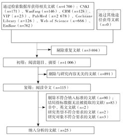 通过初步检索共获得4 700篇文献,经逐层筛选,最终纳入25篇[11,12,13,14,15,16,17,18,19,20,21,22,23,24,25,26,27,28,29,30,31,32,33,34,35]文献,其中3项[14,27,28]为队列研究,22项[11,12,13,15,16,17,18,19,20,21,22,23,24,25,26,29,30,31,32,33,34,35]为横断面研究。文献筛选流程见图1。
