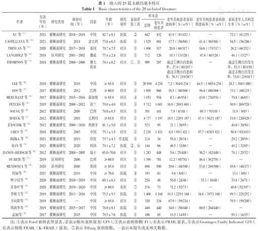 | LEE等[16] | 2018 | 横断面研究 | 2016 | 中国 | ≥65.0 | 社区 | ① | 20 898 | 4 234 | 7.2(304/4 234) | 44.5(1 885/4 234) | 28.2(304/1 080) |