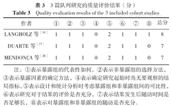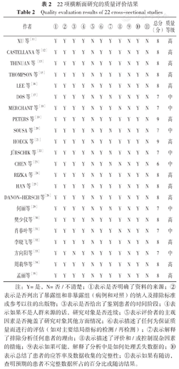22项横断面研究中,14篇[11,12,13,15,16,19,21,24,25,26,30,32,34,35]为高质量文献,8篇[17,18,20,22,23,29,31,33]为中等质量文献(表2);3篇[14,27,28]队列研究在NOS上的得分均≥7分(表3)。