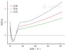 本研究尚存在局限性:首先,本研究使用南通市一般人群的发病率计算SIR,而不包含T2DM的人群,这可能导致SIR被低估;其次,本研究的吸烟、饮酒等协变量以及糖尿病药物并未考虑时变的可能;此外,T2DM早期的就诊可能增加恶性肿瘤的检出率。为此,本研究排除118名T2DM病程<1年合并恶性肿瘤患者进行敏感性分析,结果发现关联结果不变,稳定性较好。最后,本研究是基于医院T2DM患者的队列研究,有待进一步推广。