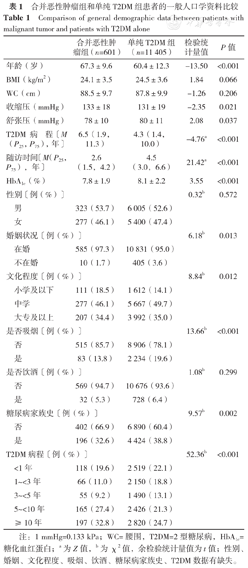 合并恶性肿瘤组和单纯T2DM组患者的一般人口学资料比较