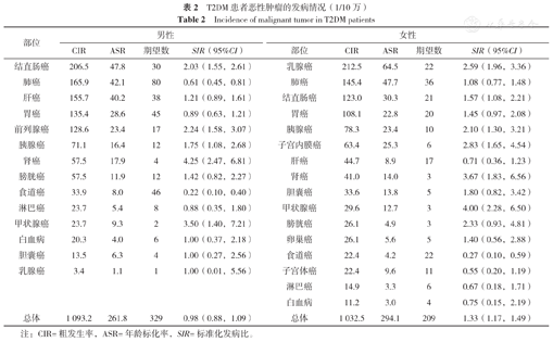 T2DM患者并发各癌种的前5顺位,男性依次为结直肠癌、肺癌、肝癌、胃癌、前列腺癌;女性依次为乳腺癌、肺癌、结直肠癌、胃癌、胰腺癌。男性T2DM患者恶性肿瘤的总发病率与一般男性无差异,而其中并发结直肠癌、前列腺癌、胰腺癌、肾癌、甲状腺癌的发生率高于一般男性,并发肺癌、食道癌的发病率低于一般男性。女性T2DM患者并发恶性肿瘤的总发病率高于一般女性,其中并发乳腺癌、结直肠癌、胰腺癌、子宫内膜癌、肾癌、甲状腺癌的发病率高于一般女性,并发食道癌的发病率低于一般女性,见表2。