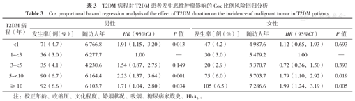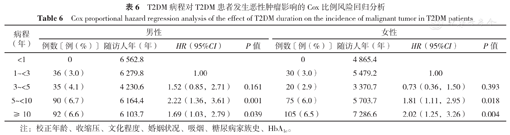 Cox proportional hazard regression analysis of the effect of T2DM duration on the incidence of malignant tumor in T2DM patients
