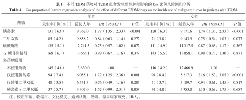 校正变量为年龄、收缩压、文化程度、婚姻状况、吸烟、糖尿病家族史、HbA1c,以是否发生恶性肿瘤为因变量(否=0,是=1),分别以是否服用胰岛素(否=0,是=1)、是否服用二甲双胍(否=0,是=1)、是否服用磺酰脲类(否=0,是=1)、是否服用α糖苷抑制剂(否=0,是=1)、多药物联用(不使用药物=1,仅使用胰岛素=2,仅使用二甲双胍=3,胰岛素+二甲双胍=4)为自变量,进行Cox比例风险回归分析,结果显示,与未使用胰岛素的患者相比,使用胰岛素分别增加男性77%和女性74%的并发恶性肿瘤的风险;与未使用药物的患者相比,仅使用胰岛素的T2DM患者分别增加男性72%〔HR=1.72,95%CI(1.25,2.36)〕和女性116%〔HR=2.16,95%CI(1.53,3.05)〕的并发恶性肿瘤的风险,见表4。