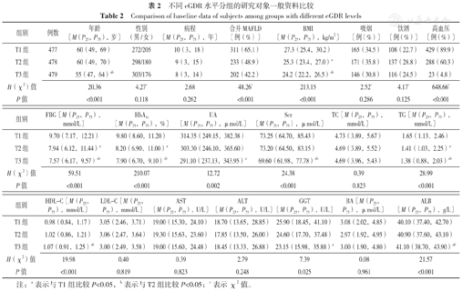2.2 不同eGDR水平分组的研究对象一般资料比较 3组研究对象年龄、合并MAFLD比例、BMI、高血压比例、FBG、HbA1c、UA、Scr、TG、HDL-C、GGT、ALB比较,差异有统计学意义(P<0.05),其中T3组高血压比例、年龄、BMI、FBG、HbA1c、Scr、TG低于T1、T2组,GGT低于T1组,HDL-C、ALB高于T1、T2组;T2组高血压比例、BMI、FBG、HbA1c、TG低于T1组,差异有统计学意义(P<0.05);3组性别、病程、吸烟及饮酒比例、TC、LDL-C、AST、ALT、BA比较,差异无统计学意义(P>0.05),见表2。