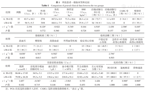| >30 d组 | 37 | 58.5±9.2 | 29/8 | 168.6±7.5 | 74.2±10.6 | 25.9±2.7 | 34(91.9) | 1.4±1.0 | 0 | 13(35.1) |