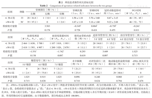 除>30 d组中1例患者穿刺成功但导丝置入困难、改为经桡动脉入径外,其余患者dTRA穿刺、置管均成功,成功率为98.6%(69/70)。69例dTRA穿刺、置管成功患者中≤30 d组、>30 d组各有1例患者因既往行经皮冠状动脉球囊扩张术、残余狭窄程度轻而未行二次PCI,因此经评估需行二次PCI者67例;最终1例患者因前降支近段CTO、导丝未通过而未完成二次PCI,其余66例患者均成功完成二次PCI,成功率为98.5%(66/67)。两组患者穿刺部位、穿刺次数、穿刺时间、冠状动脉造影时间、PCI时间、放射线剂量、放射线暴露时间、血管腔内影像使用率、造影导管型号、指引导管型号、鞘管型号、术中换鞘率、经评估需行二次PCI者所占比例、桡动脉造影前硝酸甘油使用率、dTRA相关并发症发生率比较,差异无统计学意义(P>0.05),见表2。