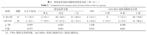 两组患者左主干病变、CTO发生率比较,差异无统计学意义(P>0.05);两组患者病变血管支数、ACC/AHA冠状动脉病变分型比较,差异有统计学意义(P<0.05),见表3。