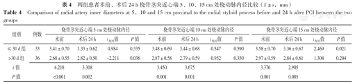 Comparison of radial artery inner diameters at 5,10 and 15 cm proximal to the radial styloid process before and 24 h after PCI between the two groups