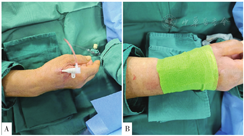 对于dTRA组患者,选择其拇长伸肌腱与拇短伸肌腱之间(鼻烟壶区)桡动脉远端作为穿刺点(图1A),术后先采用一3 cm×3 cm无菌纱布对叠成方形后置于穿刺点,再采用弹力绷带进行加压包扎(图1B),一般在术后1~2 h解除部分压力,8~10 h后完全解除压迫。