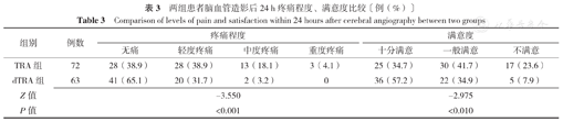 dTRA组患者脑血管造影后24 h疼痛程度轻于TRA组,满意度高于TRA组,差异有统计学意义(P<0.05),见表3。