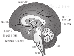 组胺是一类广泛分布于体内、具有多种生理活性的神经递质。中枢神经系统中,下丘脑的结节乳头体核(tuberomammillary nucleus,TMN)[1]中有大量组胺能神经元胞体集中分布,其发出的突起投射至中枢神经系统几乎所有的功能区,包括大脑皮质、杏仁核、纹状体、海马、黑质、视网膜和脊髓等。TMN有广泛的投射和联系系统(图1),可调节多种脑功能,如睡眠-觉醒、学习与记忆、神经内分泌、饮水摄食、感觉运动。目前已发现的组胺受体有H1、H2、H3、H4亚型[2]。中枢神经元中,H1、H2、H3受体均有表达。H1受体广泛分布于新皮层、海马、丘脑、下丘脑、杏仁核等脑区,激活该受体引起神经元兴奋[3],H2受体主要调节胃酸分泌,H3受体位于突触前膜,作为自身受体负反馈调节组胺的合成与释放,H3受体也存在于其他神经元末梢和某些细胞上,调节γ-氨基丁酸、去甲肾上腺素、乙酰胆碱等神经递质的释放[4]。