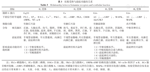 表3概述了组胺受体在前庭系统及相关脑区的分布、偶联G蛋白及下游信号转导通路、细胞功能分布以及影响前庭功能的可能作用机制[4,7,8,9,10,11,12,13]。